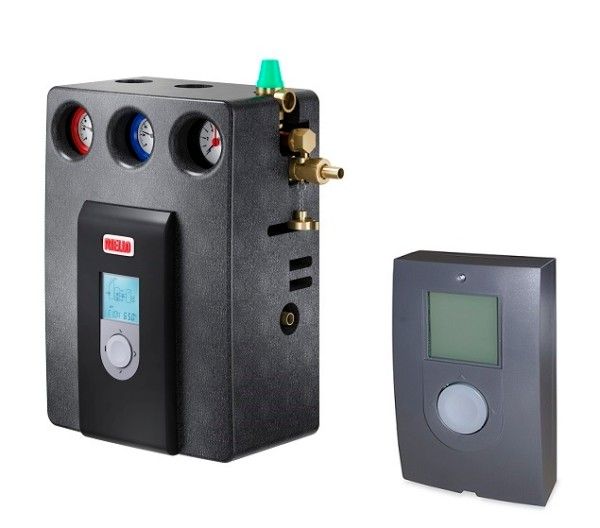 The pump stations RSS MRS and MR are provided with circulator pump with PWM controlling, safety devices, filling taps, non-return valve, flow and return temperature gauge. RSS R is provided with circulator pump both for ON-OFF and PWM controlling, safety devices, filling taps, flow regulator and flow meter, non-return valve and temperature gauge.